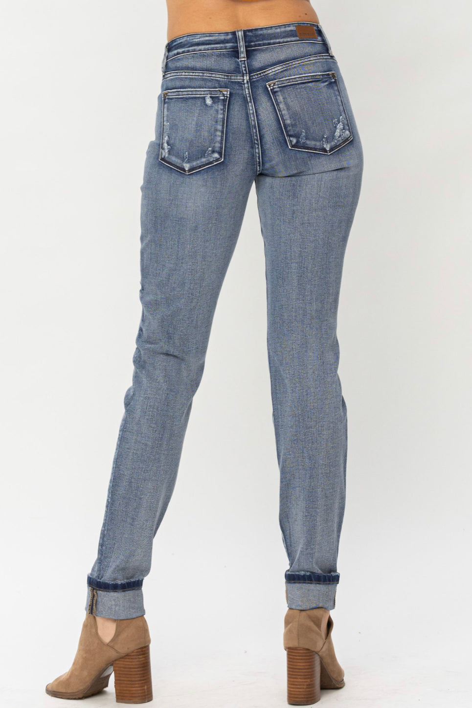Judy Blue's Button Fly Cuffed Boyfriend jeans are the perfect way to stay stylish and comfortable. Featuring a contrast wash, cuffed ankles, and a button fly, these jeans are sure to flatter any body type.